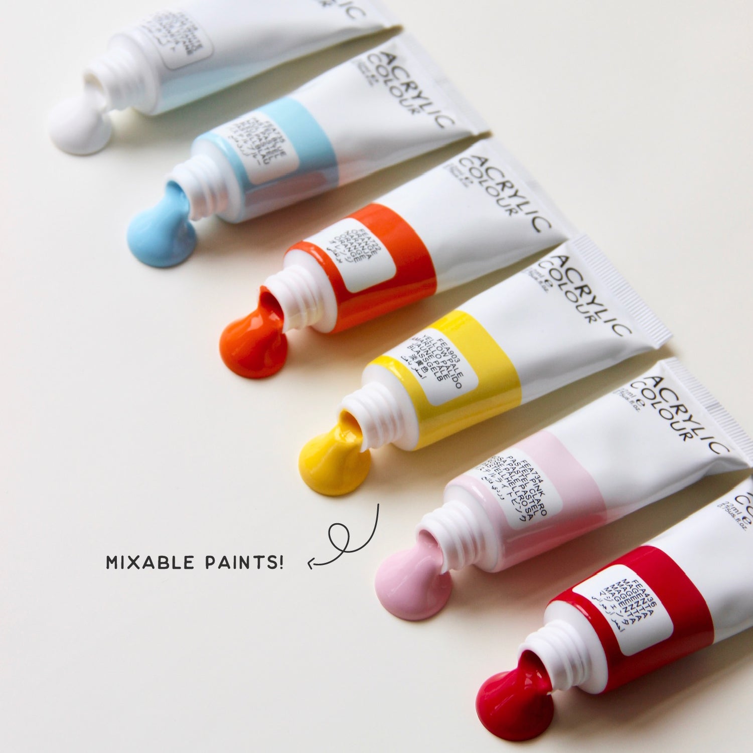 - 6 acrylic paints in white, red, yellow, pink, orange and blue. Fully mixable colors, so you can create your own colors and truly customize your pieces. Plus we’ve included a color mixing guide to help you get the shades you love.