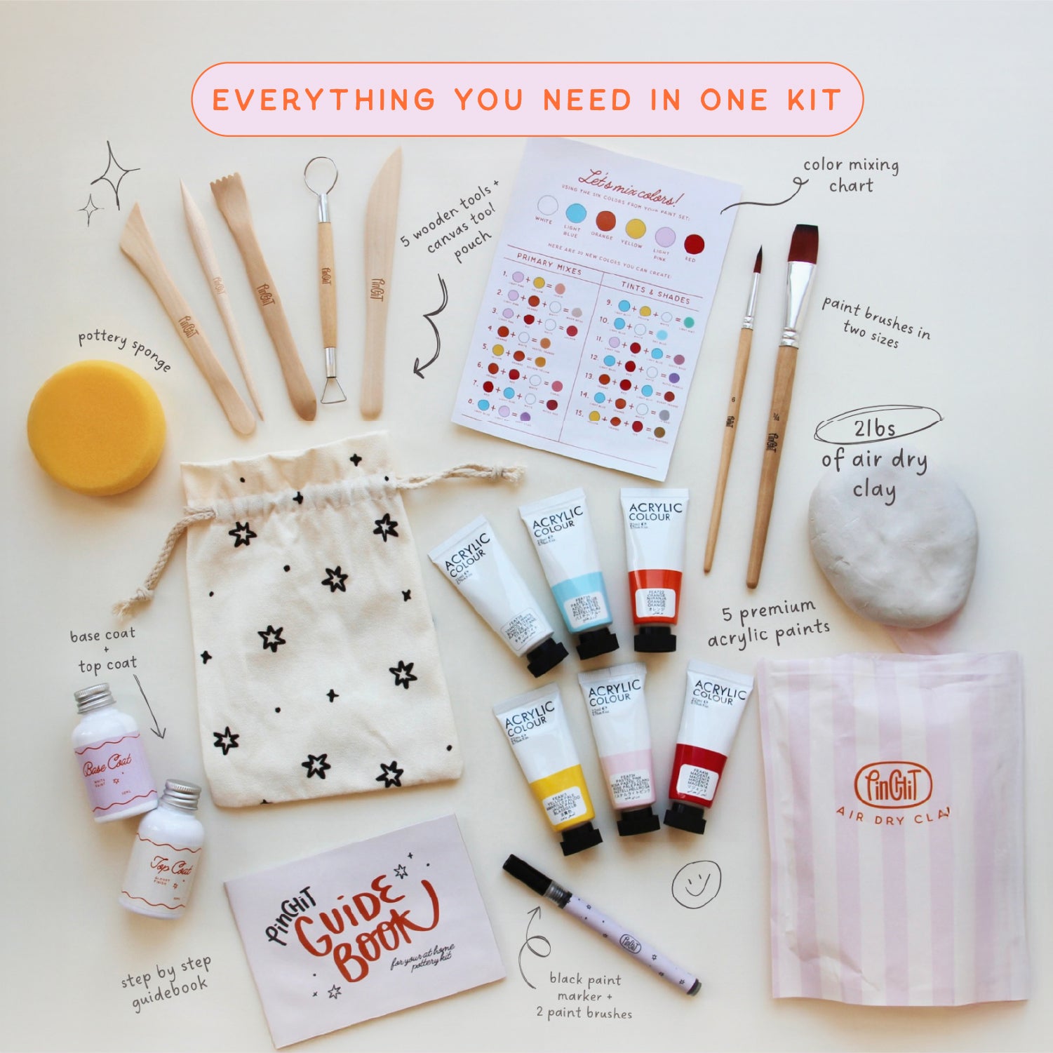 - Complete DIY Pottery Kit – Includes 2 lbs. of premium air-dry clay, sculpting tools, sponge, paint brushes, base coat, 6 acrylic paints, sealant, fine-tip marker & instructional booklet.